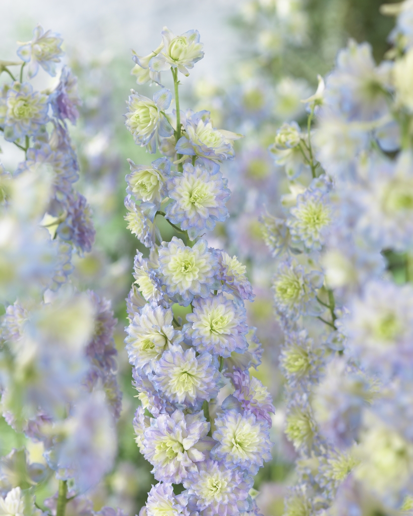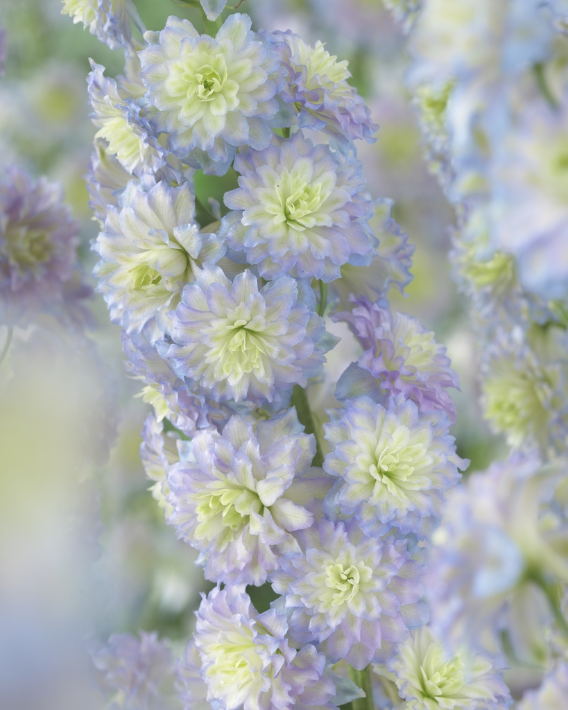 fully double pale lilac with pale blue border and green centre, sturdy flower spike stays standing where other delphiniums fall down