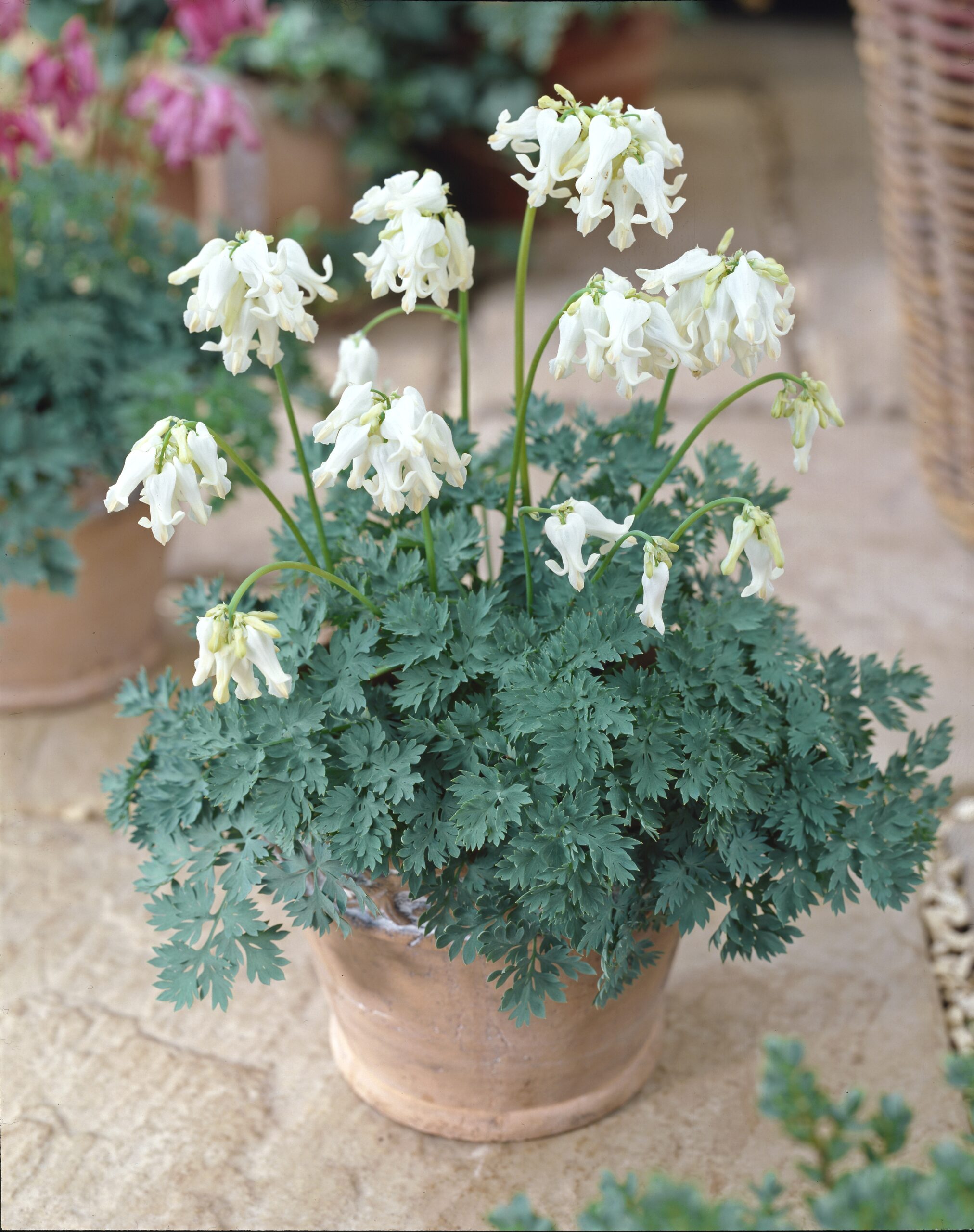 ivory white heart-shaped flowers, fern-like blue-green foliage
